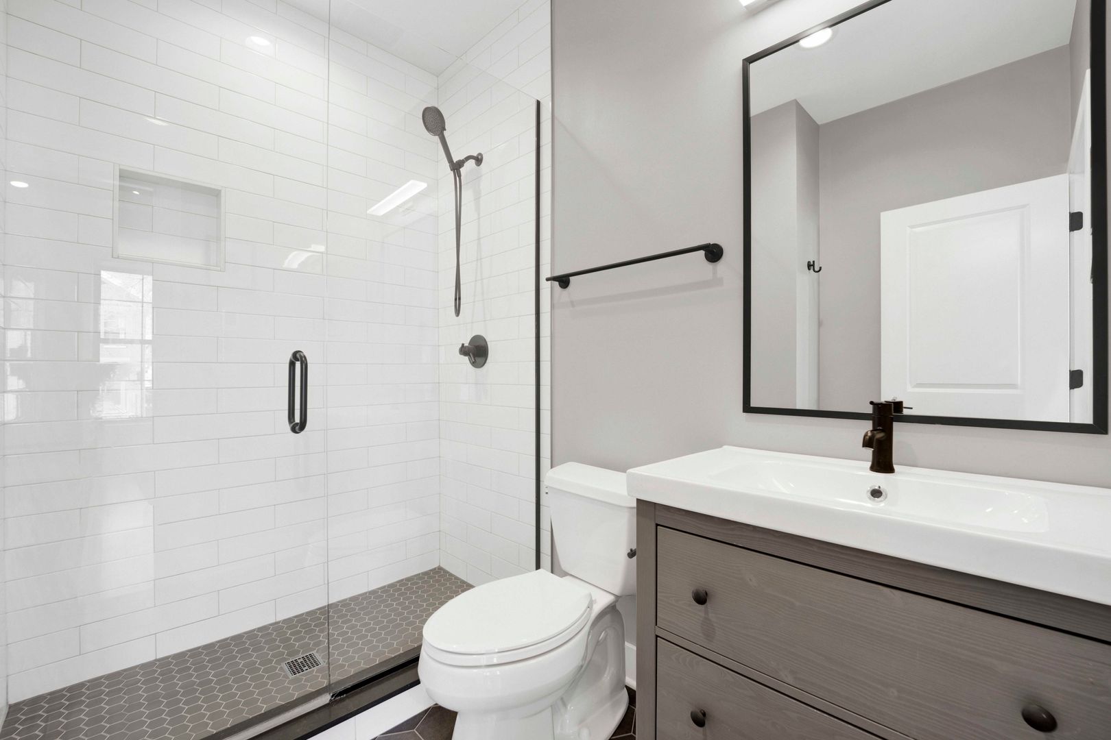 The open-concept living and dining area flows seamlessly into a modern kitchen with quartz countertops, stainless steel appliances, and sleek cabinetry. Spacious bedroom with great closet space and two full bathrooms featuring heated floors—one with a walk-in glass shower and the other with a full tub.